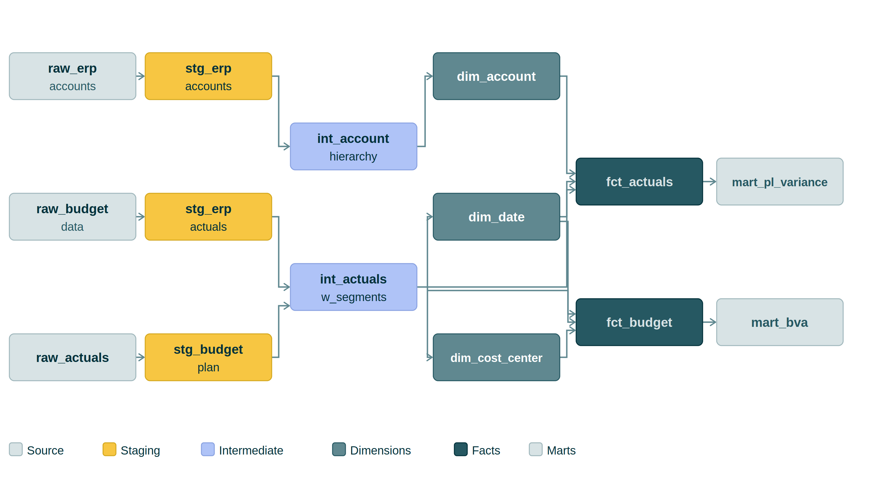 In a typical financial reporting setup, staging models clean and standardize raw data from source systems without applying any business rules. Intermediate models join and reshape staged data, applying logic like cost allocations or segment assignments. Dimension models produce the reusable reference tables that everything else joins to - accounts, cost centers, organizational hierarchies, date periods. Fact models hold the grain-level financial data. Mart models are the report-ready outputs, such as a pre-aggregated P&L view, a budget variance summary, or a headcount report by cost center.